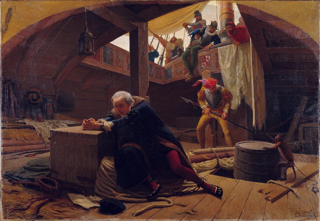 This is the moment Delleani captures. Columbus, shackled and disgraced, arrives at Cádiz in late 1500, not as a hero but as a prisoner.